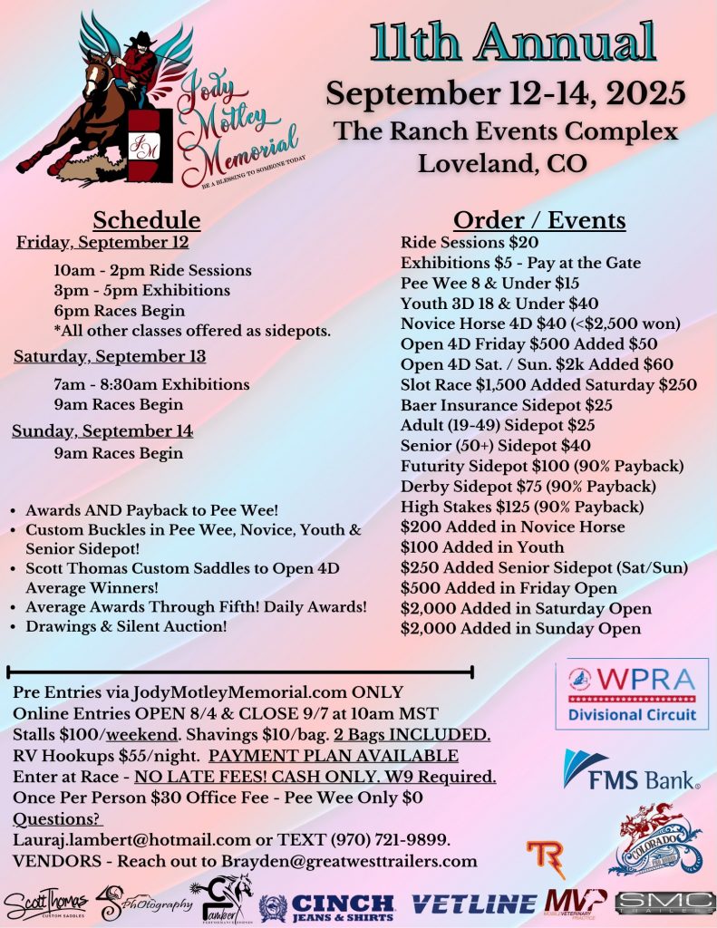 Entries/Stalls/RV all OPEN! Visit jodymotleymemorial.com