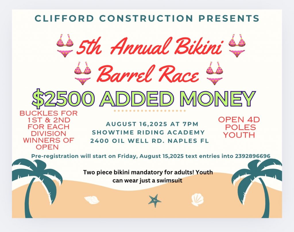 Get those Bikinis Ready!!!! It’s time for our 5th annual fundraiser Bikini Barrel Race sponsored by Clifford Construction!! Thank you Jim Clifford for the $1500.00 Added money for the race!!! Aug 16,25 Open 4D only rule must wear a 2 piece bikini! Youth can wear a swimsuit.
