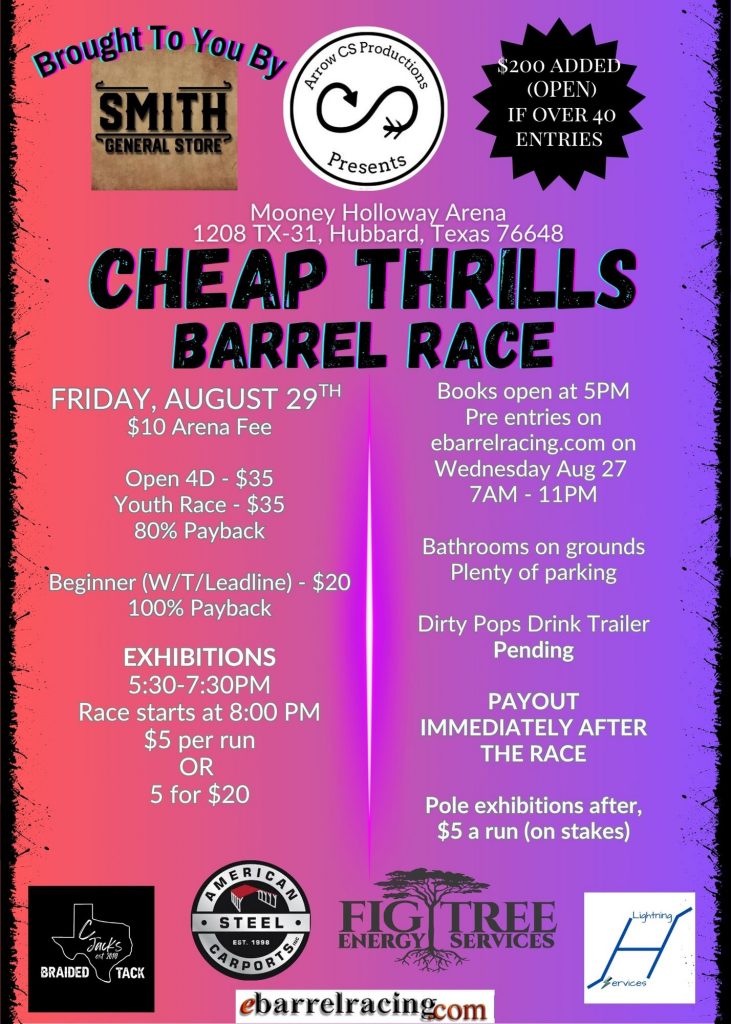 Cheap Thrills Race at Hubbard outdoor pen… $250 ADDED AT OVER 40, thanks to Smith General Store in Corsicana! Show them some love, so they’ll keep supporting you guys every year.