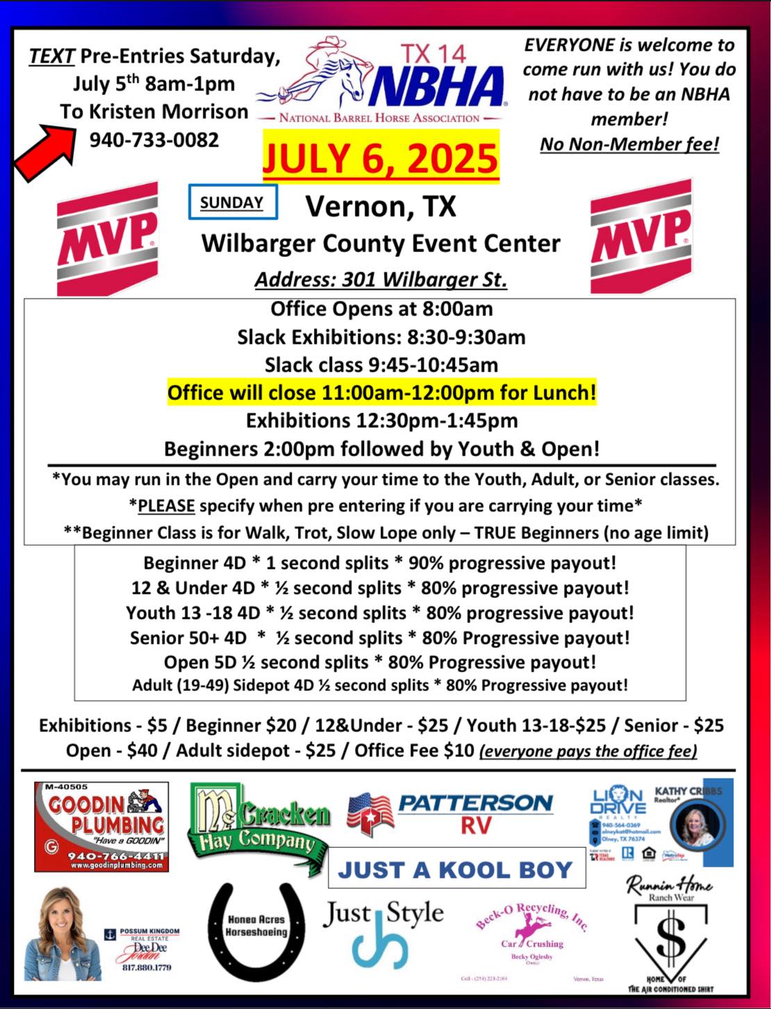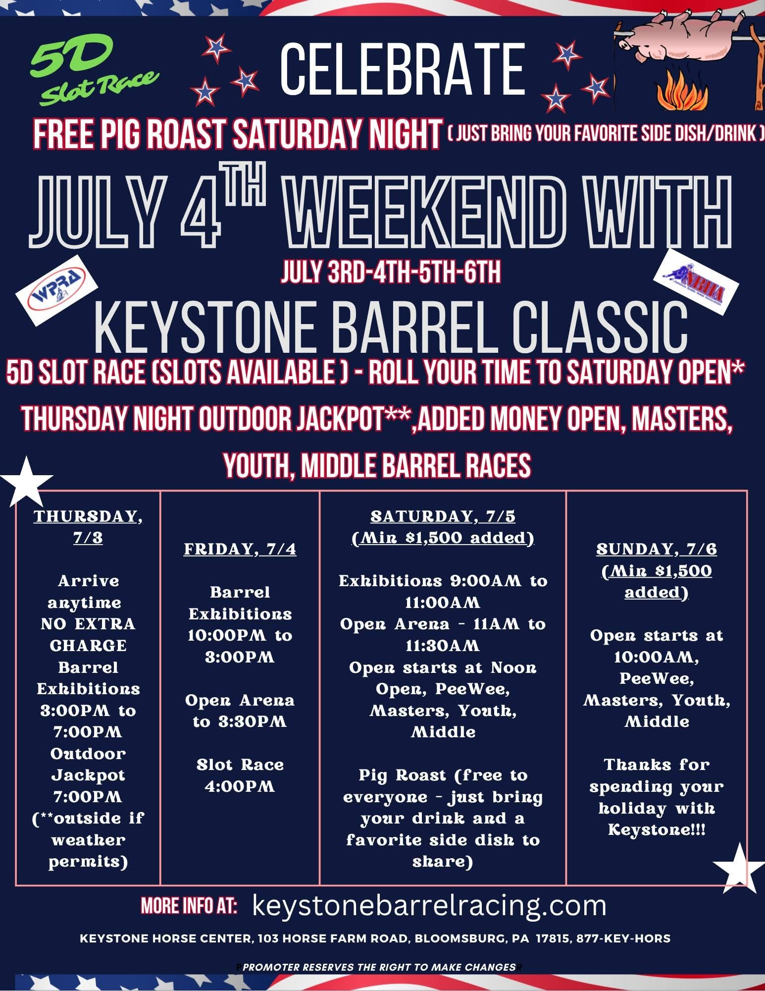 ![]() Farm, Home, & Youth Foundation 2025 Barrel Buckle Series WPRA-Open 4D Approved First FrontierNBHA PA03 & PA04 SanctionedIBRA PA East SanctionedTIP Jr & Non-Jr High Point Barrels Open 4D Barrels $40 • Youth, Middles, Masters 3D Barrels $30 • Peewee 3D Barrels $5 • Open 3D Poles $30Cash entries for 70% cash payback – no […] ![]() Dusty Diamonds Dash Race 15D Open Barrel Race(1/2 second splits)$600+ AddedBuckles to Open D winners 4D Youth, Adult & Masters(1/2,1/2,whole second splits) 3D Poles(Whole second splits) 75%payout 100% of added money payouts IBRA SanctionedWTBHA SanctionedBBR Pending Barrel Training 11AMShow at 5PM Poles, Beginner, Open, Youth, Adult, and Masters . Rollovers are allowed from Open to […] |