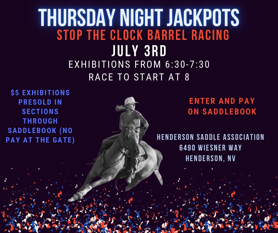 ![]() Stop the Clock Barrel RacingHenderson Saddle Association6490 Wiesner WayHenderson, NVRace at 8:00pmAll entries and payments done on SaddleBookExhibitions 6:30-7:30 $5 each sold only on SaddleBookNo dogs allowed at facilities |