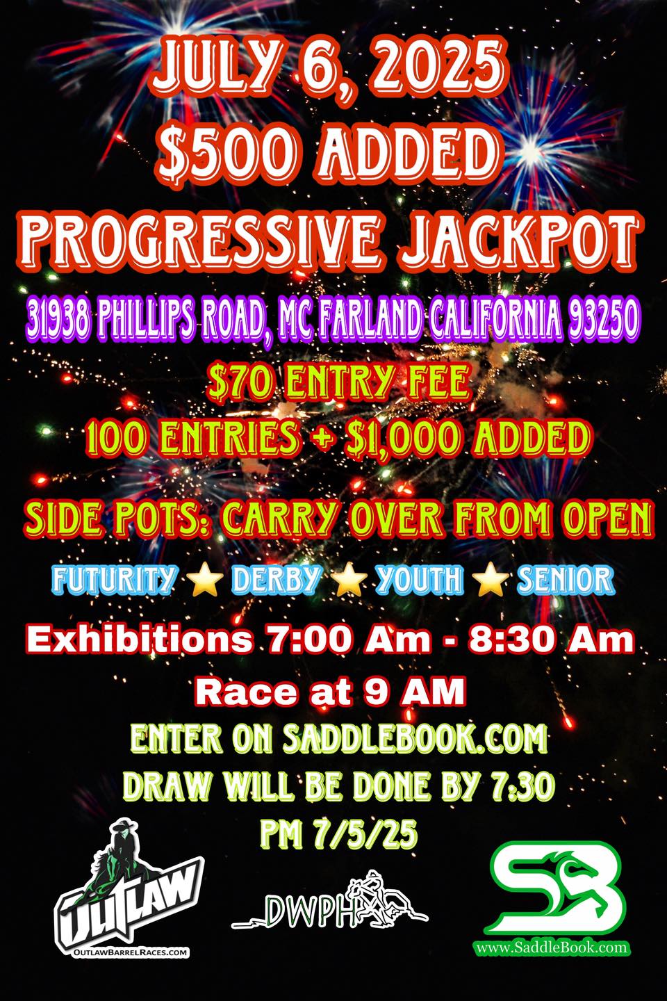 ![]() Next Sunday head on over to DWPH in Mc Farland, to run in the $500 Added Progressive Jackpot.If there is 100+ Entries we will add $1,000Enter on Saddlebook.com at 7:30 Pm July 5.