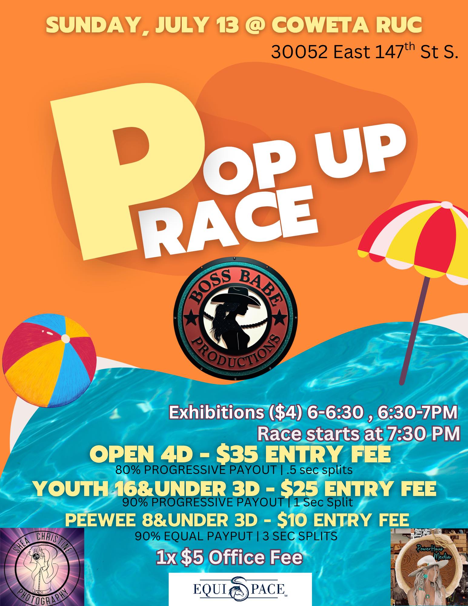 ![]() Pop Up Race! This is a SUNDAY EVENING race. Get out of church in time & come run with us at Coweta Round Up ClubWe will have Pre entries open morning of July 3!The Salty Spur will be there set up selling dirty sodas & energy drinks |