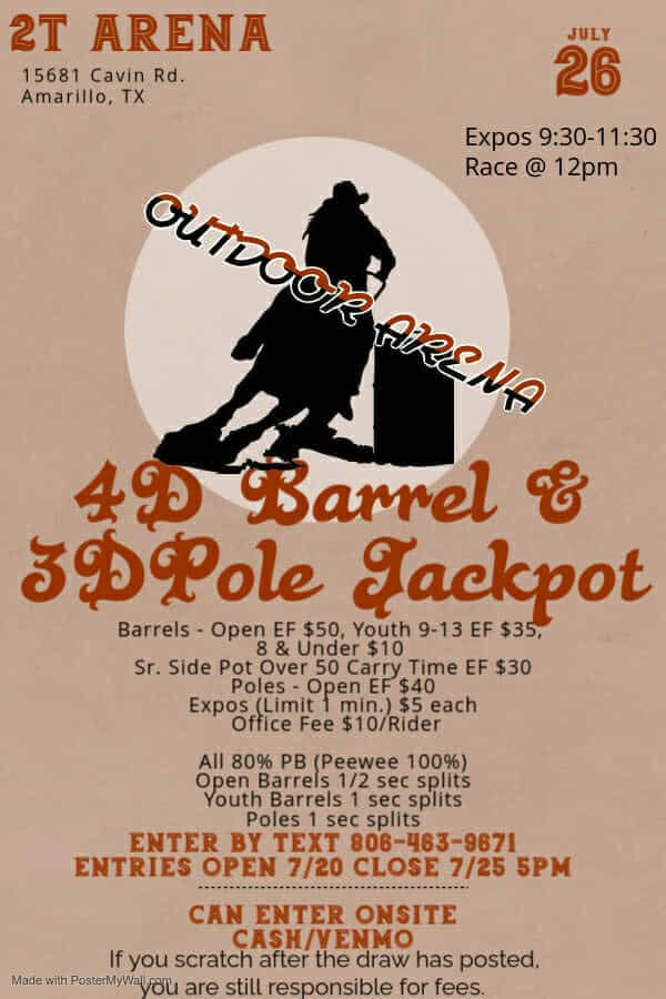 ![]() Join us for every Tuesday May 6th-July 29th for Jackpot barrels at Oasis!Pre-Entry now available the week of each race(link will be posted). **Entries are ALSO still available onsite except for session 1***Early run session NOW available-*Pre-Entry/Pre-Pay ONLYSession 1*3:30-4:00-Early Exhibition session-*Pre-Entry/Pre-Pay only*4:00-4:30-Early Run -*Pre-Entry/Pre-Pay only(maximum 20 runners)-Open to any class(peewee, open, youth, 2nd open(run time […] |