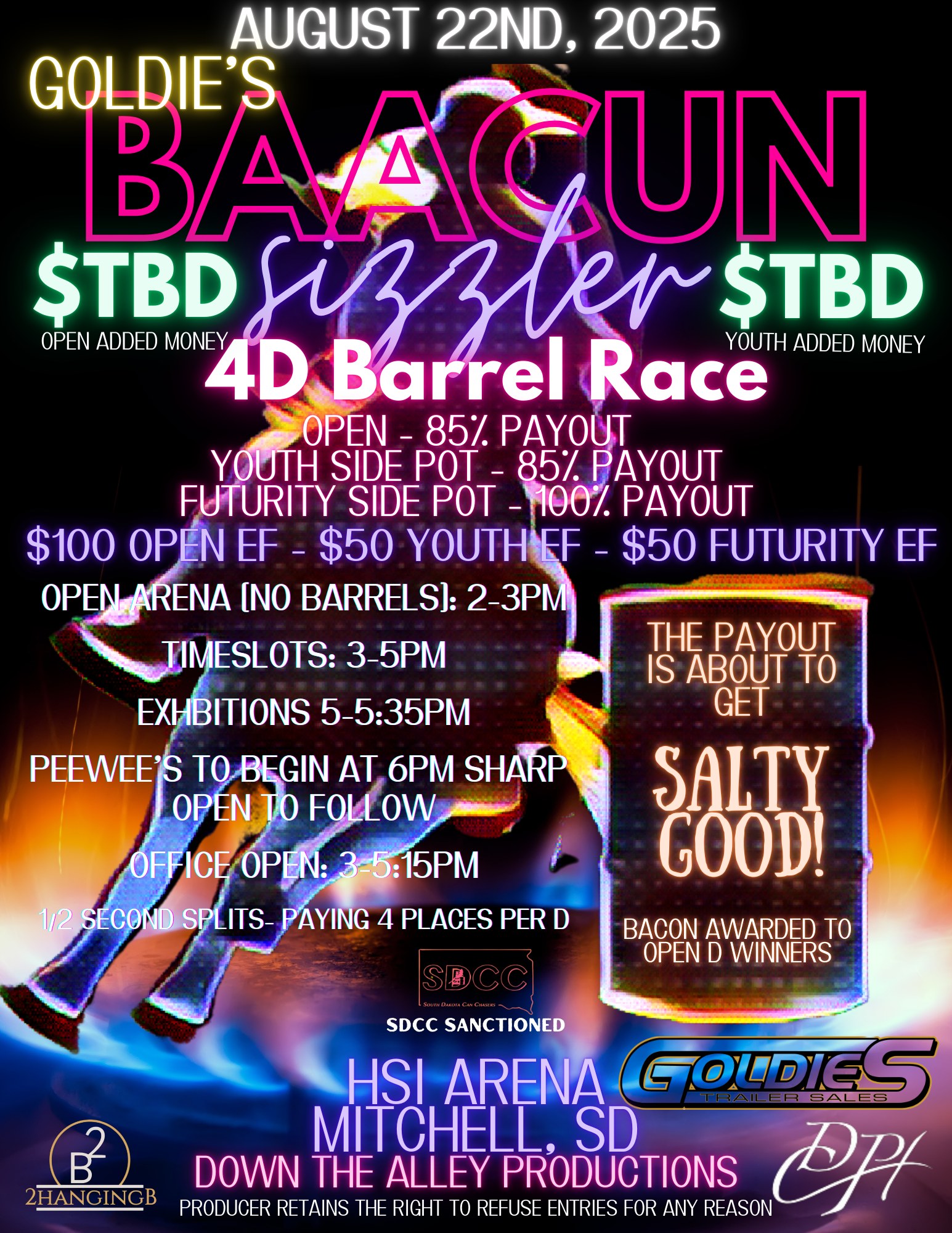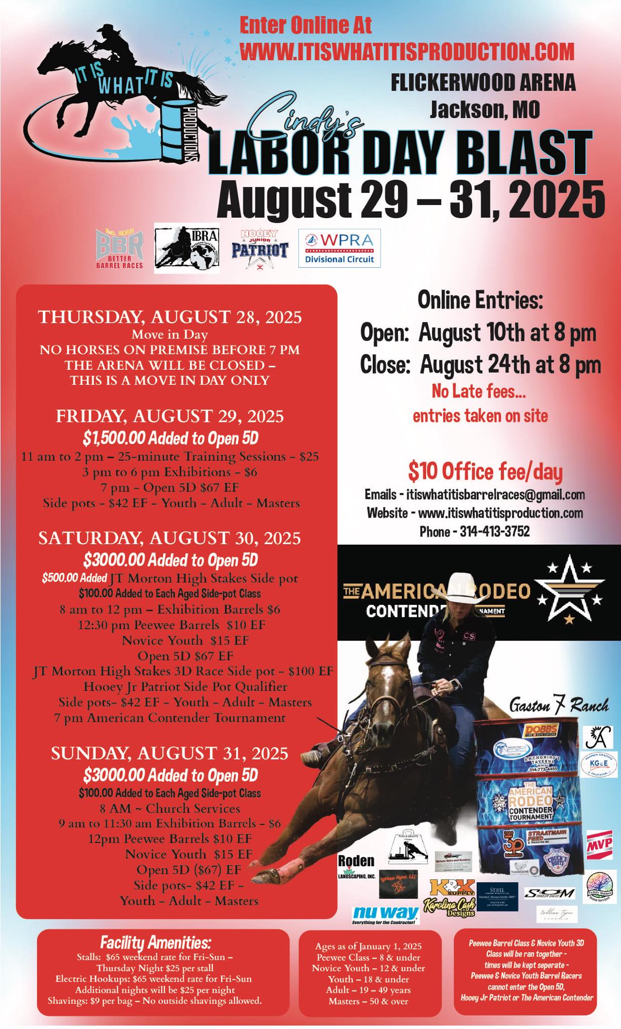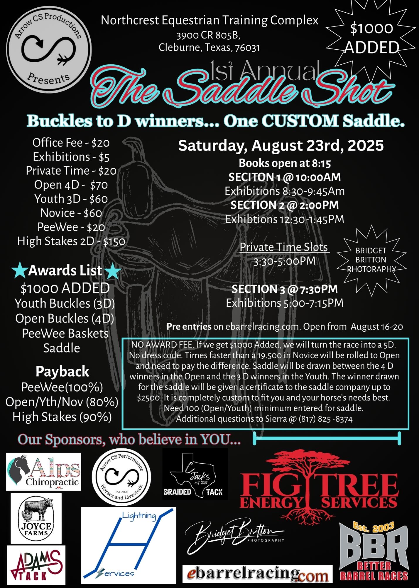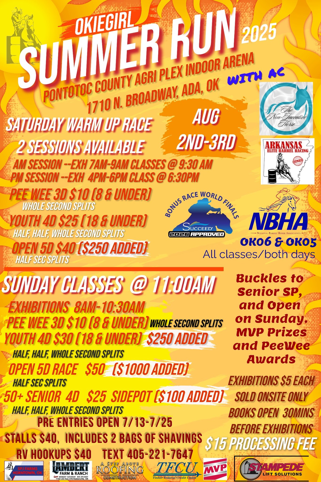 ![]() Farm, Home, & Youth Foundation 2025 Barrel Buckle Series WPRA-Open 4D Approved First FrontierNBHA PA03 & PA04 SanctionedIBRA PA East SanctionedTIP Jr & Non-Jr High Point Barrels Open 4D Barrels $40 • Youth, Middles, Masters 3D Barrels $30 • Peewee 3D Barrels $5 • Open 3D Poles $30Cash entries for 70% cash payback – no […] ![]() Alright Friday night lights has been extended! Please share! See you all Friday!Guthrie Fairground’s ArenaThis Friday!Pre enter now sgpevents.netSpeedhorse MagazineRestorEquine Fitness & TherapyEquinetyKasey Bullock - Bullock Home and LandGuthrie Fairground’s ArenaThe Good PharmaOklahoma AgCreditProfessional's ChoiceKICKERShannon Anderson PhotographyComplete Equine Performance |