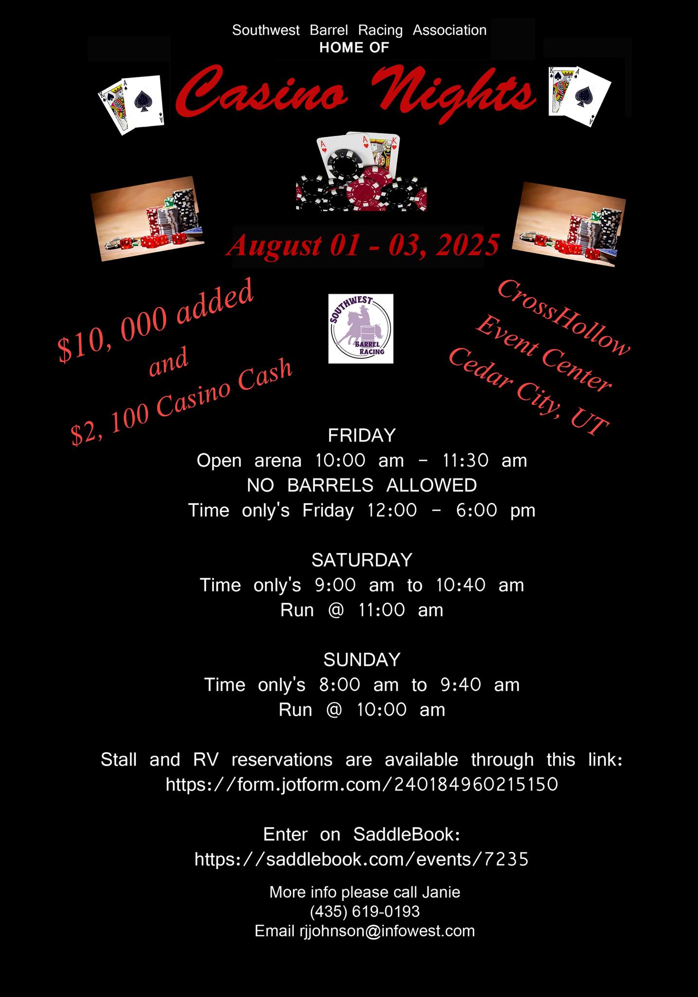 ![]() SWBRA Annual Casino Night August 1 - 3, 2025 Pre-Entry July 1 - Aug 3, 2025 Presented By Southwest Barrel Racing Association CrossHollow Events CenterCedar City, UtahAugust 1st - 3rd$10,000+ added Friday will be a 5D if over 100 runners. Saturday and Sunday are 5D All side pots are 3D. FYH will be a 2D […]