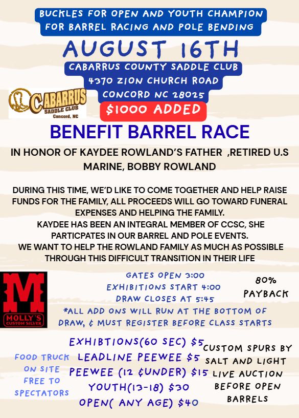 ![]() BENEFIT BARREL RACE AUGUST 161000K ADDEDBUCKLES TO OPEN AND YOUTH BARREL CHAMPIONBUCKLES TO OPEN AND YOUTH POLE BENDING CHAMPIONBENEFIT BARREL RACEIN HONOR OF KAYDEE ROWLAND’S FATHER ,RETIRED U.S MARINE, BOBBY ROWLANDDURING THIS TIME, WE’D LIKE TO COME TOGETHER AND HELP RAISE FUNDS FOR THE FAMILY, ALL PROCEEDS WILL GO TOWARD FUNERAL EXPENSES AND HELPING THE FAMILY.KAYDEE […] |