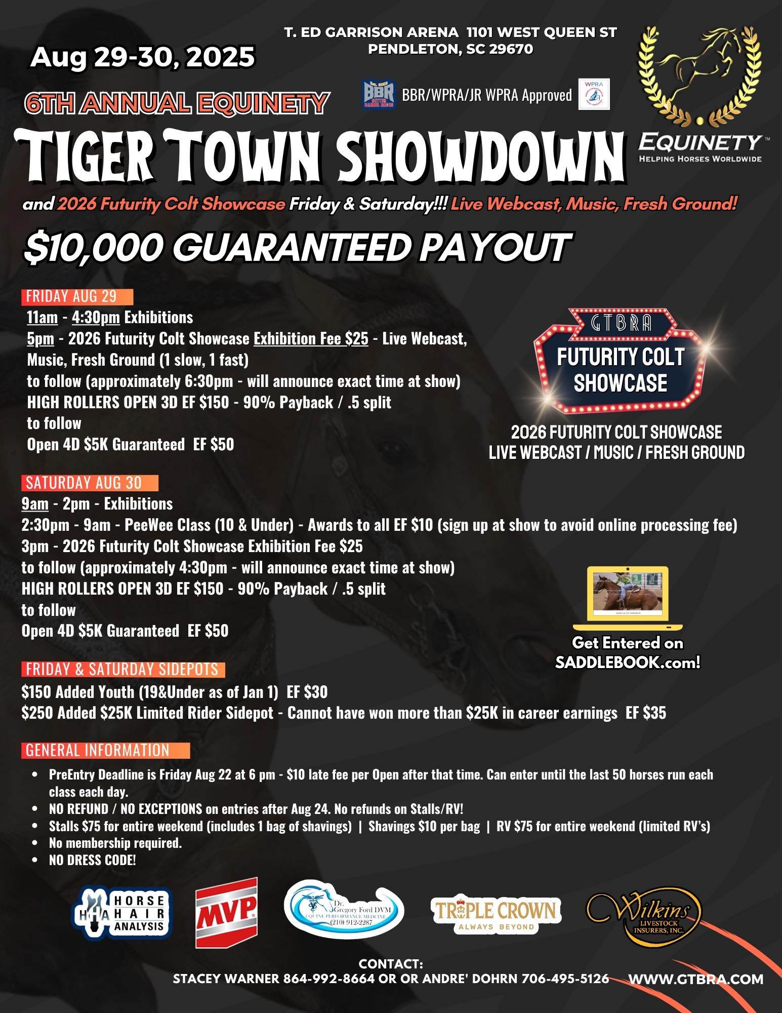 ![]() Tag & Share contestTwo winners will receive a Friday night Open entry and Free stall valued at $125Join us August 29-30 at our 7th Annual Equinety “Tiger Town Showdown” at T Ed Garrison Livestock Arena in Pendleton, SC$10k Guaranteed Payout (will Increase with more entries)New Sidepot introduced by fellow producer Sabra O'Quinn “The $25k limited rider” Sidepot (can not have won […]