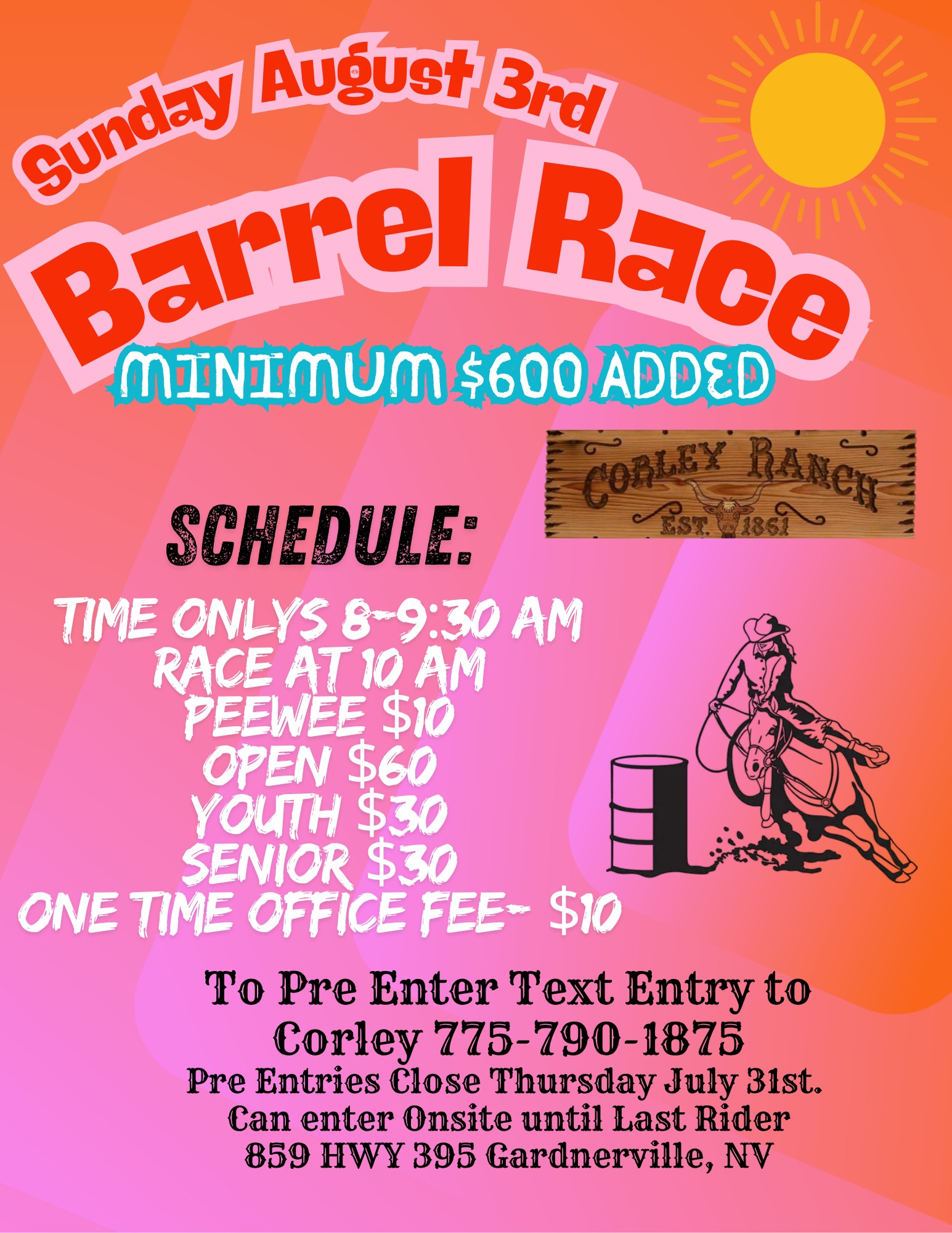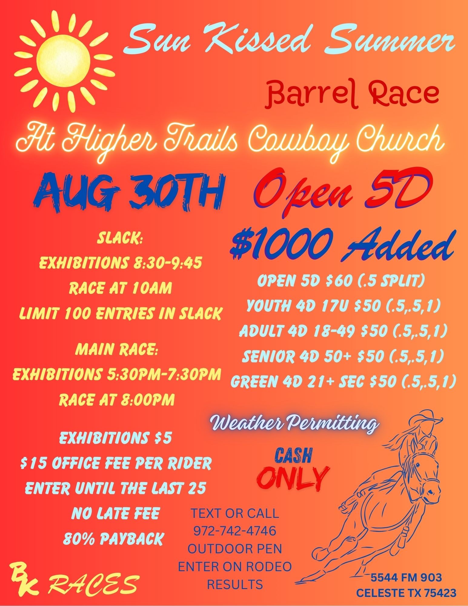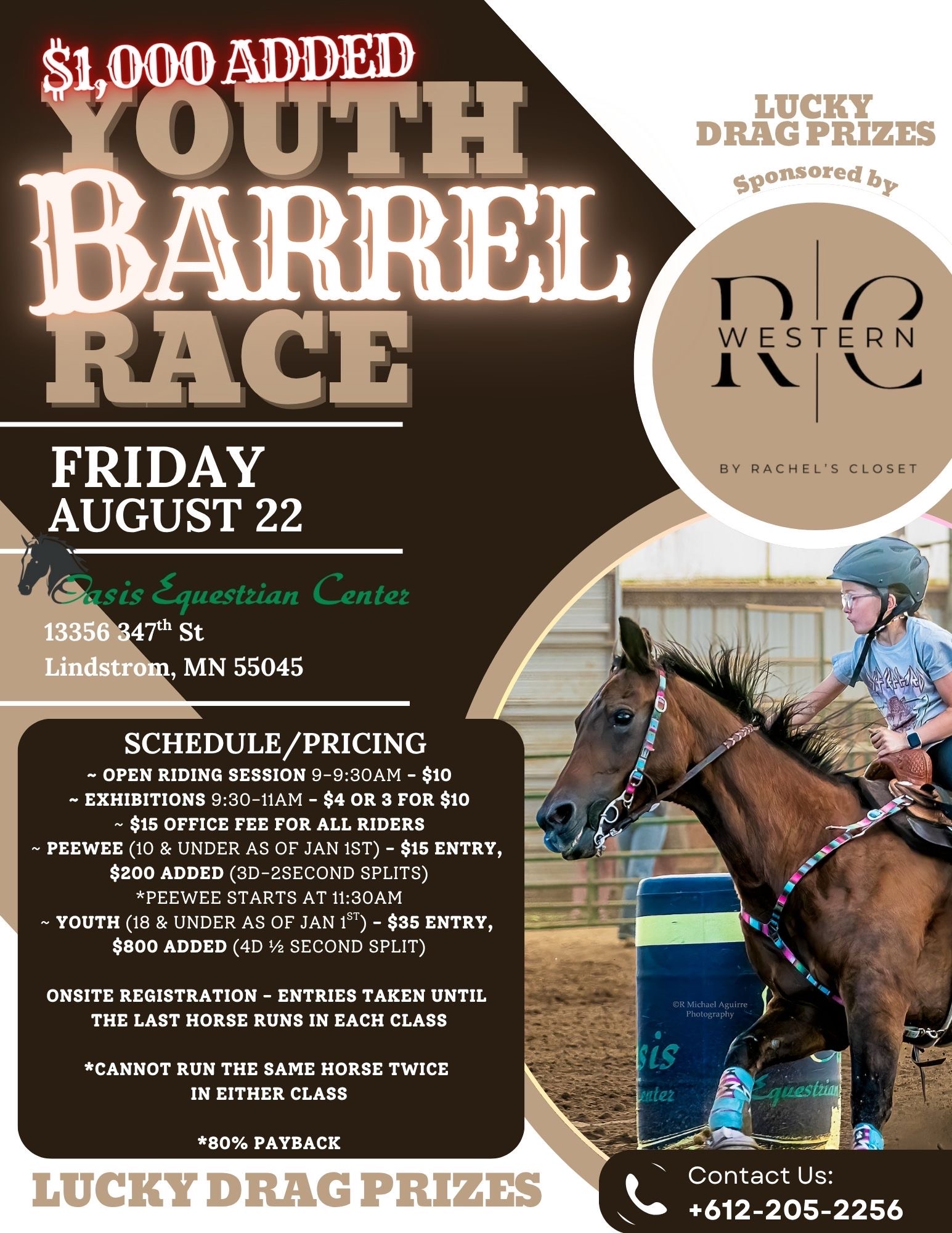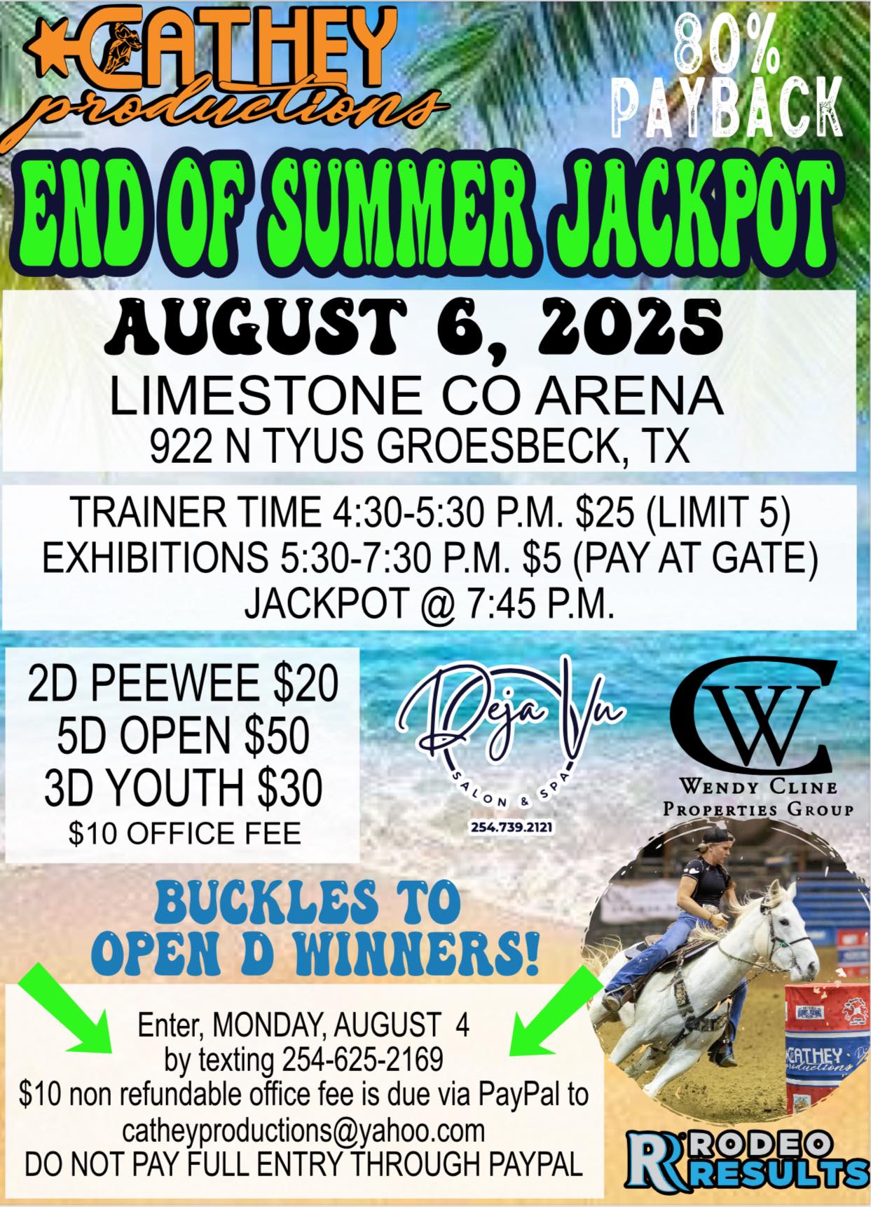![]() Sponsored by Rachel's Closet!Join us for $1000 added Jackpot Barrels at Oasis onFriday, Aug 22nd$200 added to Peewee + 80% payback(10 & under as of 1/1/25)$800 added to Youth+ 80% payback(18 & under as of 1/1/25)Lucky Drags with awards for both classes supplied by Rachel's ClosetONSITE REGISTRATION-cash/check/Venmo or PayPalOpen Riding Session 9-9:30 / Exhibitions 9:30-11a.m./Peewee […] |