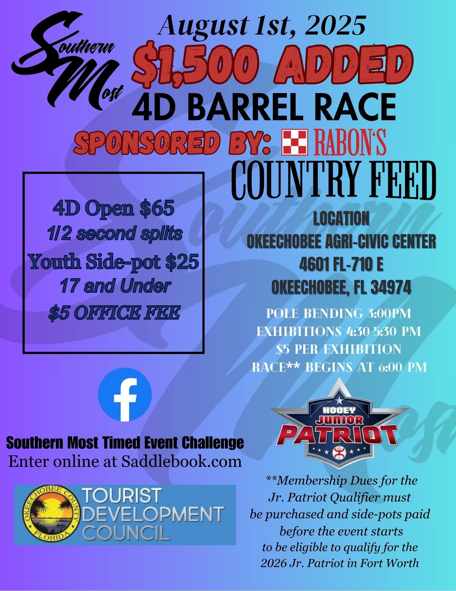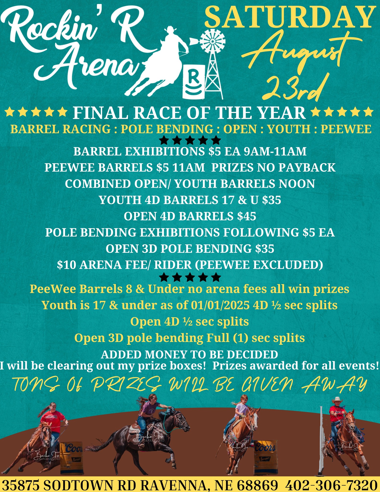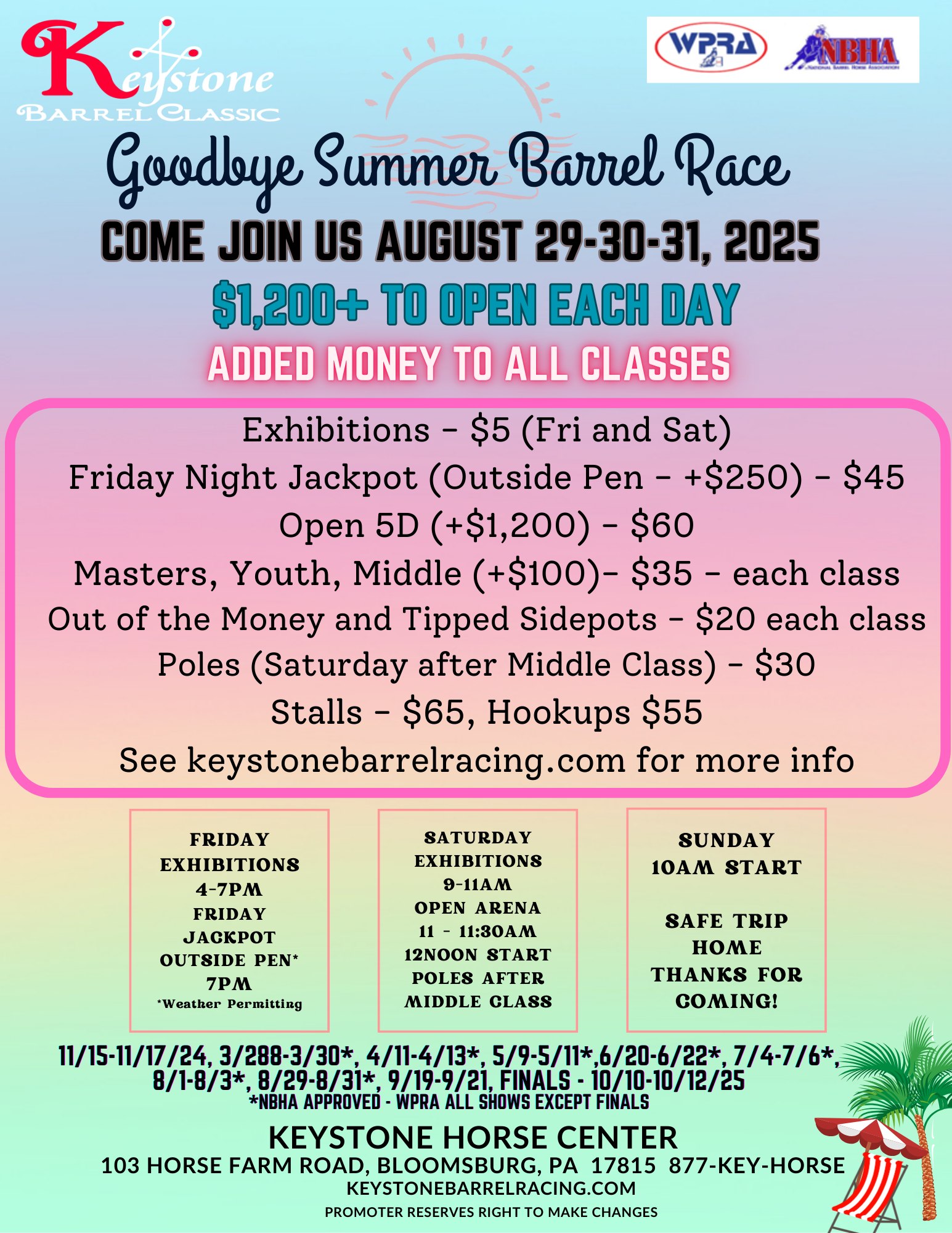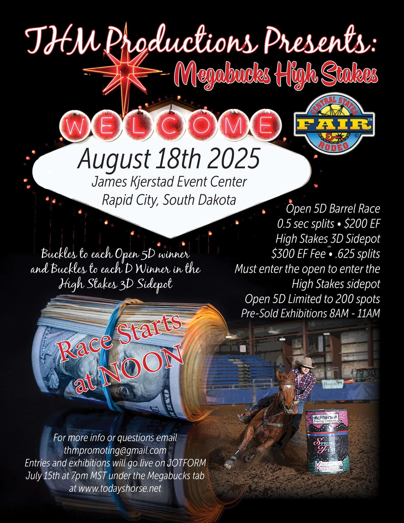 ![]() Sponsored by Rachel's Closet!Join us for $1000 added Jackpot Barrels at Oasis onFriday, Aug 22nd$200 added to Peewee + 80% payback(10 & under as of 1/1/25)$800 added to Youth+ 80% payback(18 & under as of 1/1/25)Lucky Drags with awards for both classes supplied by Rachel's ClosetONSITE REGISTRATION-cash/check/Venmo or PayPalOpen Riding Session 9-9:30 / Exhibitions 9:30-11a.m./Peewee […] |