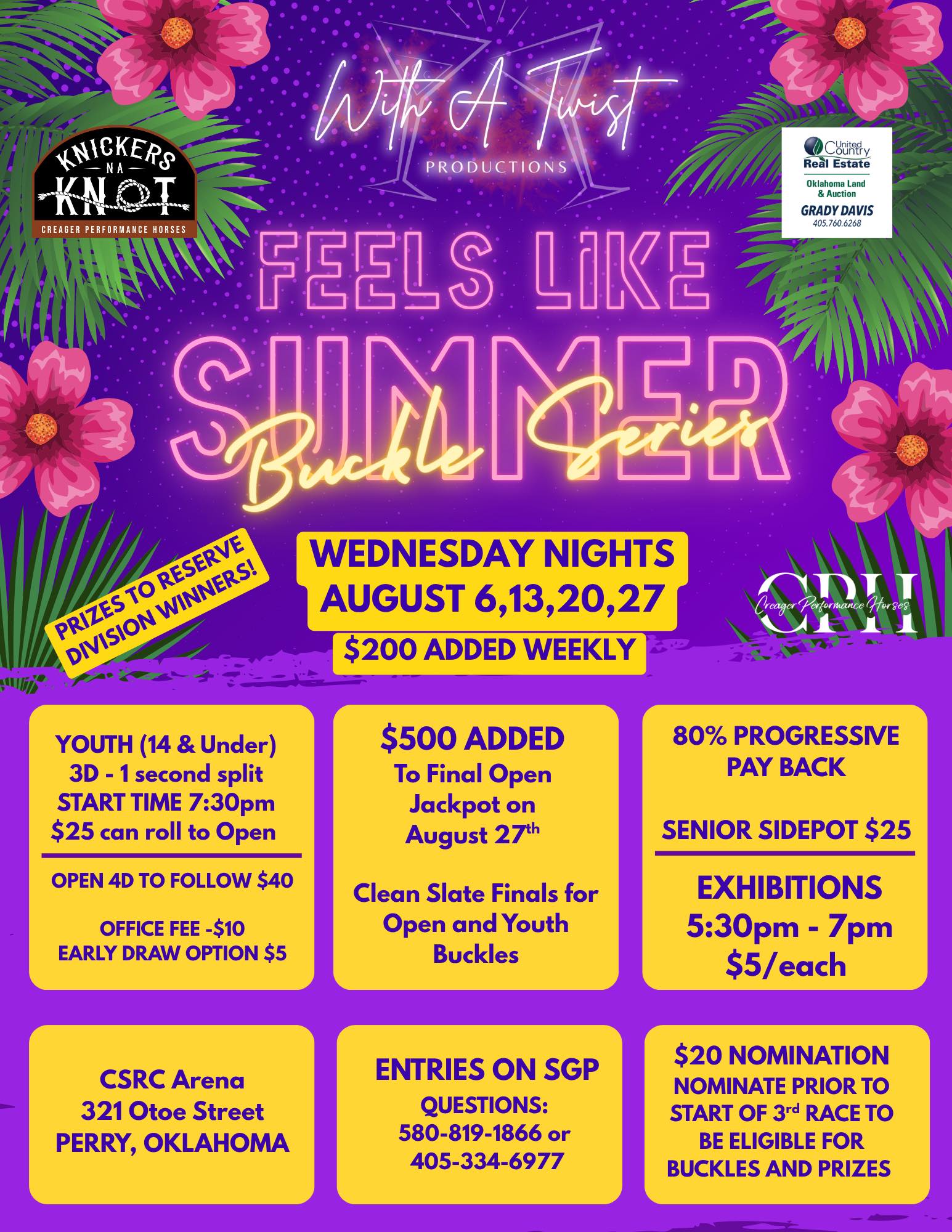 ![]() WEDNESDAY NIGHT BARREL RACING!Excited to announce 2025 schedule!Start times/pricing same as 2024.Follow Balkan Barrel Series and St.Louis County Fair Arena ![]() 4 week Wednesday night Buckle Series in Perry, Oklahoma!Added money and prizes!Follow With A Twist Productions for more information and upcoming events!