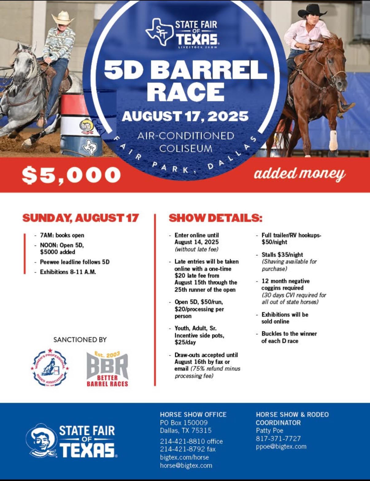 ![]() Entries are open for the State Fair of Texas Barrel Race August 17. I’ve seen some conflicting info about when entries would open up so thought I’d share. Link to entry form:https://www.equestevent.com/events/texas-state-fair-barrel-race/?_gl=1*jmf28y*_ga*MTI2NjgyNjQ4MC4xNzM2MTAyNDQ0*_ga_TFDTCV79QT*czE3NTMyOTA2MDEkbzE1OCRnMSR0MTc1MzI5MDYwNyRqNTQkbDAkaDA |